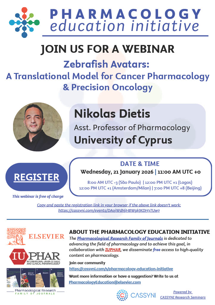 日本薬理学会が所属しておりますIUPHAR(国際薬理学会連合)から、本年1月21日に開催されます”Zebrafish Avatars: A Translational Model for Cancer Pharmacology “ IUPHAR-Elsevier Webinarの案内が届きましたので、会員の皆様にご紹介させて頂きます。